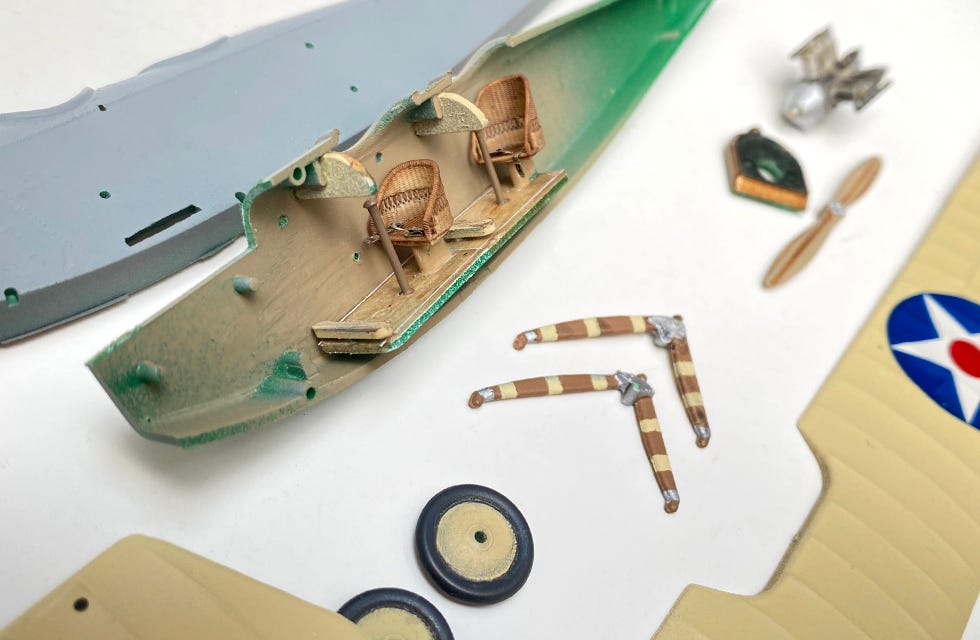Like the real thing, the cockpit is a simple affair—two seats, control sticks, rudder bars and a pair of shapes that double as control panels. Paint the cockpit floor and the control panels a light tan, then lightly streak with a darker color to imitate wood grain. Paint the inside of the cockpit area a slightly darker tan. A pair of after-market resin seats with a period wicker look will take the place of the kit parts. Add a pair of simple seat belts to give cockpit some extra interest. The kit provides a couple of decals that represent the few cockpit instruments.